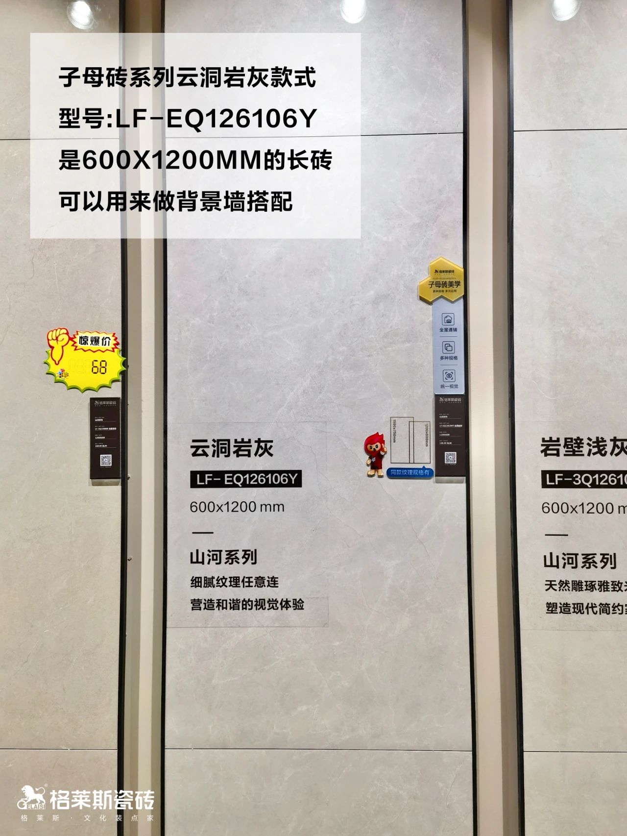 瓷砖版面数多那家里铺完的整体效果就越自然,如果花色粗糙版面数量少,装到家里就会很呆板生硬。他们家的春雾纹理非常细腻像春日的浅浅雨雾,整体呈浅灰色很适合现代简约,月白风清的纹理清雅舒适,有6个版面还可实现任意连纹,让人非常心动!!另外还有一种是有多种规格可以选择的子母砖,“举个栗子”:子母砖系列云洞岩灰,有三个不同的规格进行搭配,有方砖,长砖和大长砖,不仅可以根据需求对应尺寸选择,全屋通铺也能统一视觉、大气美观,根据咱家需求进行灵活搭配就行~!